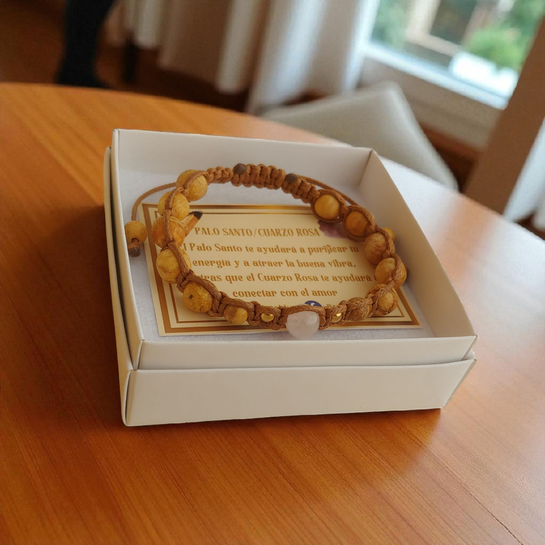 🕯️ Pulsera hecha a mano con Palo Santo, cuarzo rosa.